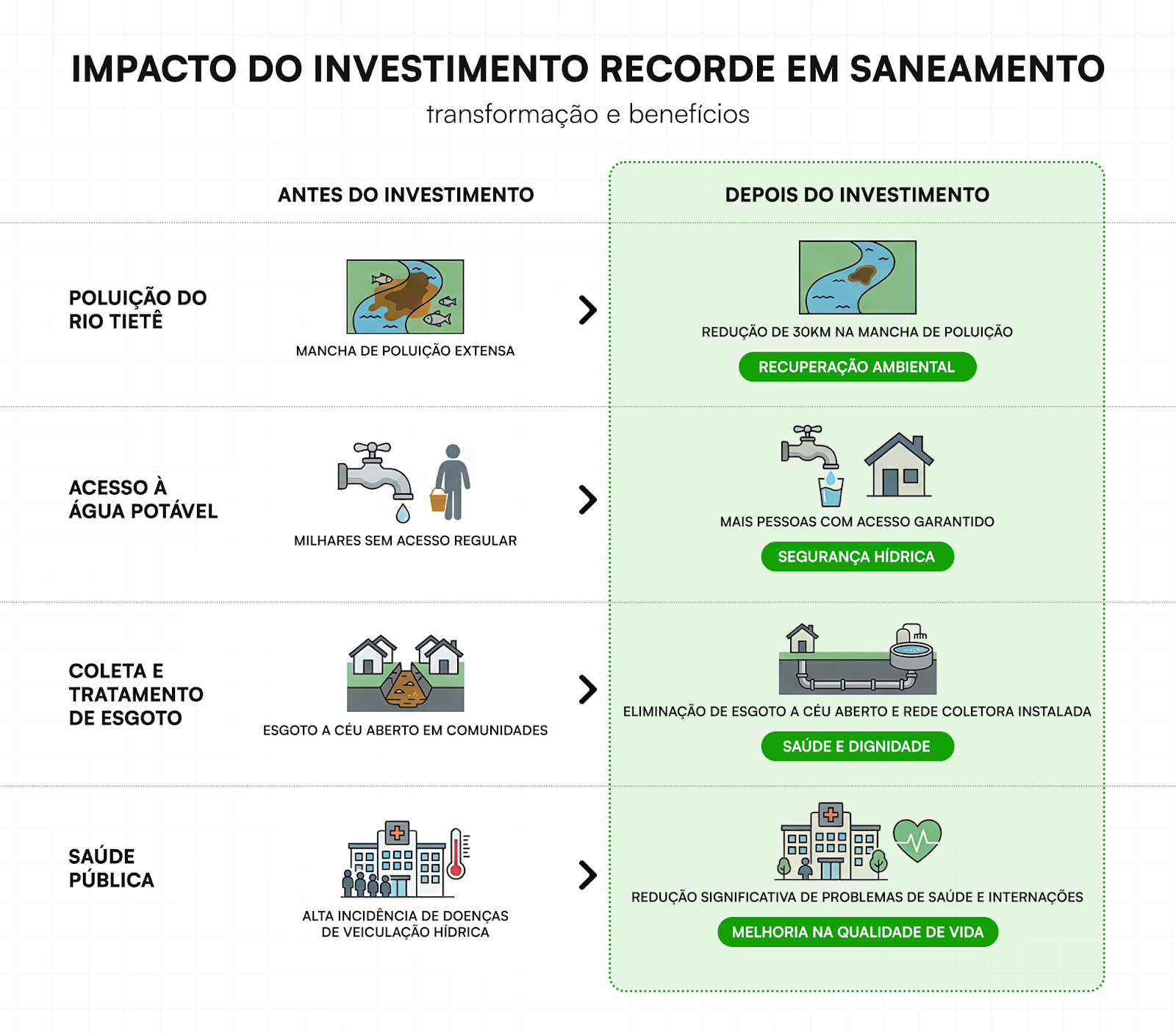 Assim como a família de Jeferson, milhões de famílias paulistas passaram a contar com serviços de saneamento básico desde a desestatização da Sabesp, em julho de 2024. Em 2025, a Companhia realizou investimento recorde de R$ 15,2 bilhões, frente aos R$ 6,9 bilhões do ano anterior, ampliando o acesso aos serviços, promovendo ganhos em saúde pública e contribuindo para a melhoria da qualidade de rios, córregos e praias.